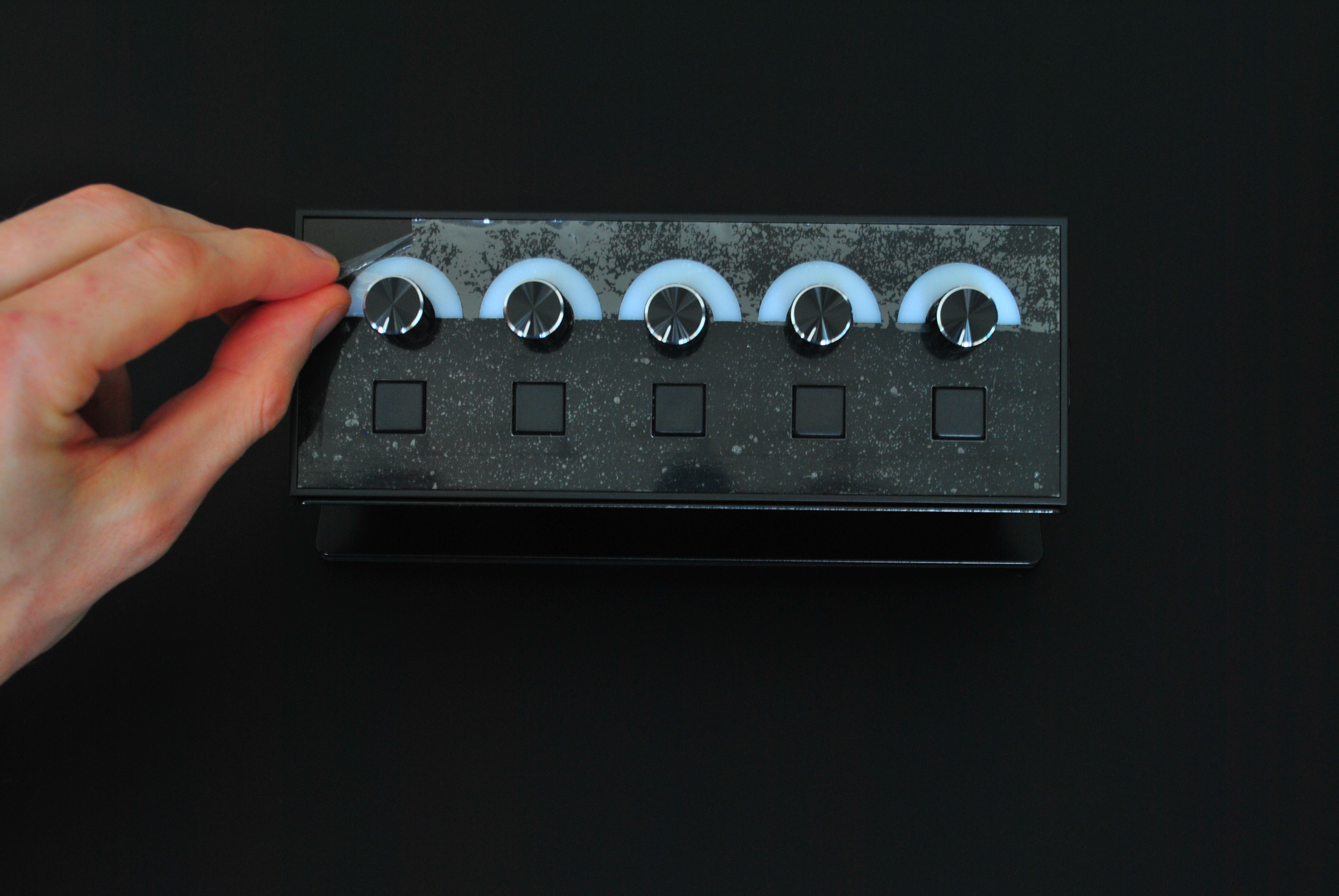 Peel off the protective film. Start peeling from top left corner and pull down under the knobs to bottom left corner, and then pull across to the right.
